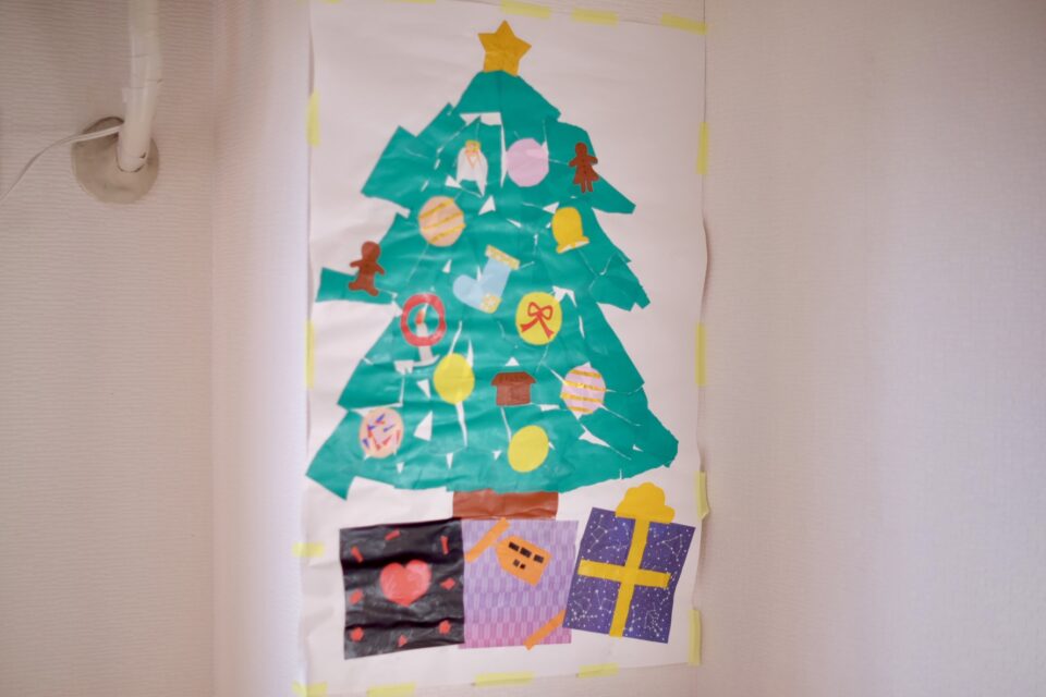 今年も、折り紙コラージュのクリスマスツリーを作りました。
