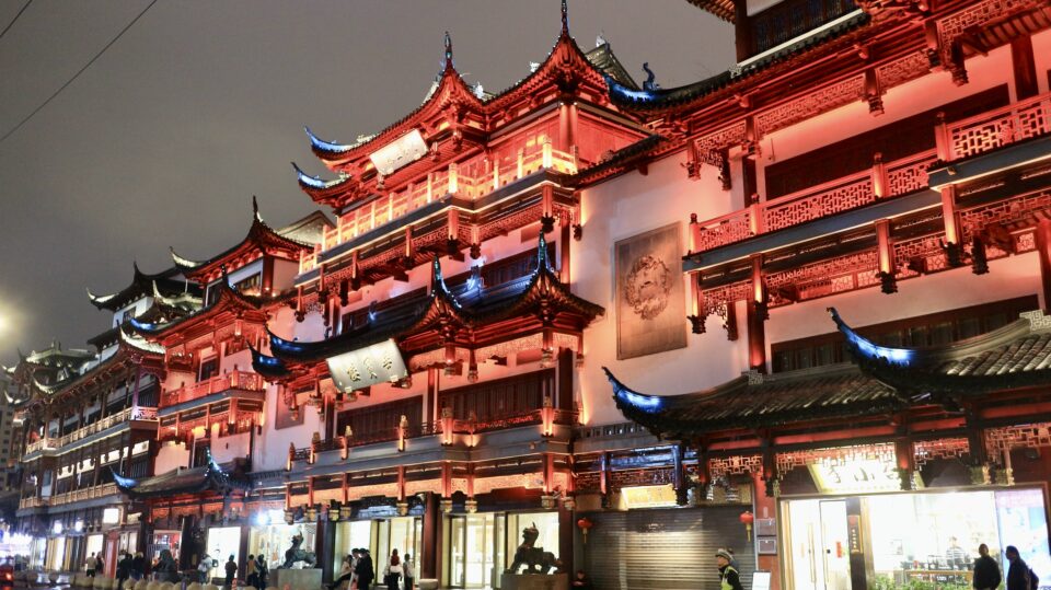豫園という庭園の周りにある歴史的な外観のショッピング街。