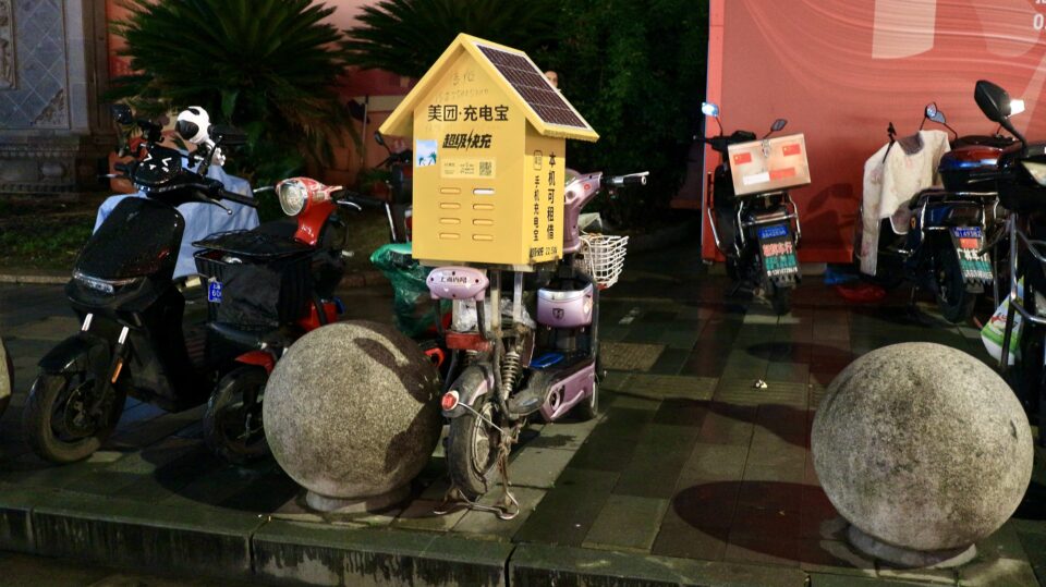 駐車中の自転車の荷台にモバイルバッテリーの貸出機。